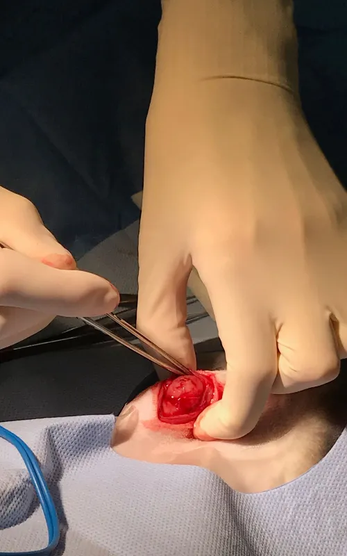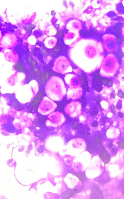 Lando first saw his local vet in May 2023 after a firm swelling appeared under his chin. A fine needle aspirate showed significant pyogranulomatous inflammation and numerous yeast forms consistent with Cryptococcus species.
